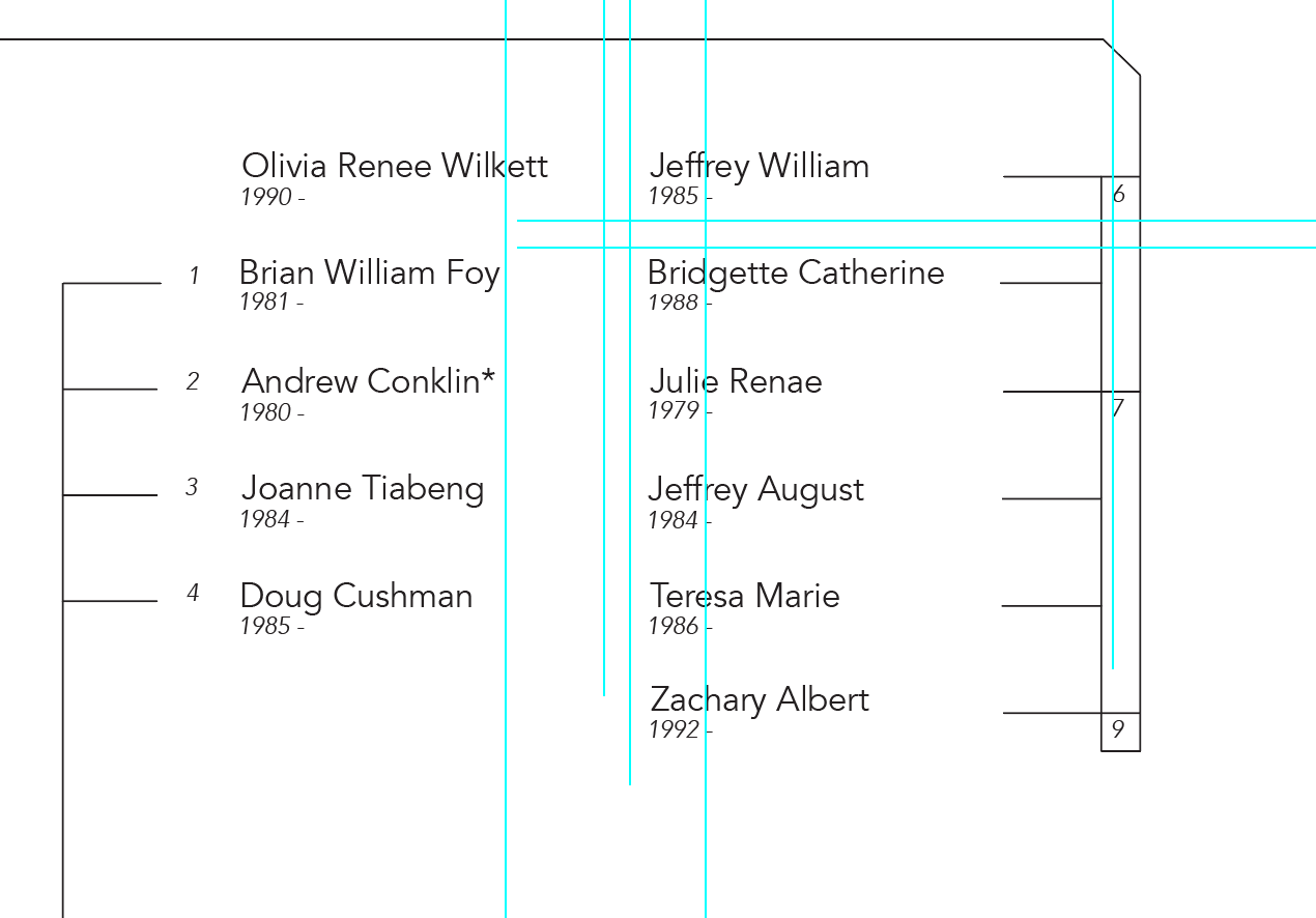 My goal was to organize a large amount of information into a legible hierarchy of a modern family tree, experimenting with typography, alignment, visual connections, and composition.